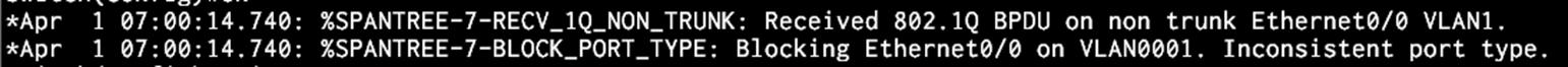 ( 사진 2. Trunk 가 아닌 포트에 802.1Q 에 해당하는 BPDU 를 수신하여 , 일치하지 않는 Port Type 으로 인해 Block 된 로그 )