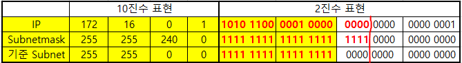 - 172.16.0.1의 기준 서브넷은 Class B로 255.255.0.0이며 서브네팅된 subnetmask는 255.255.240.0이다.